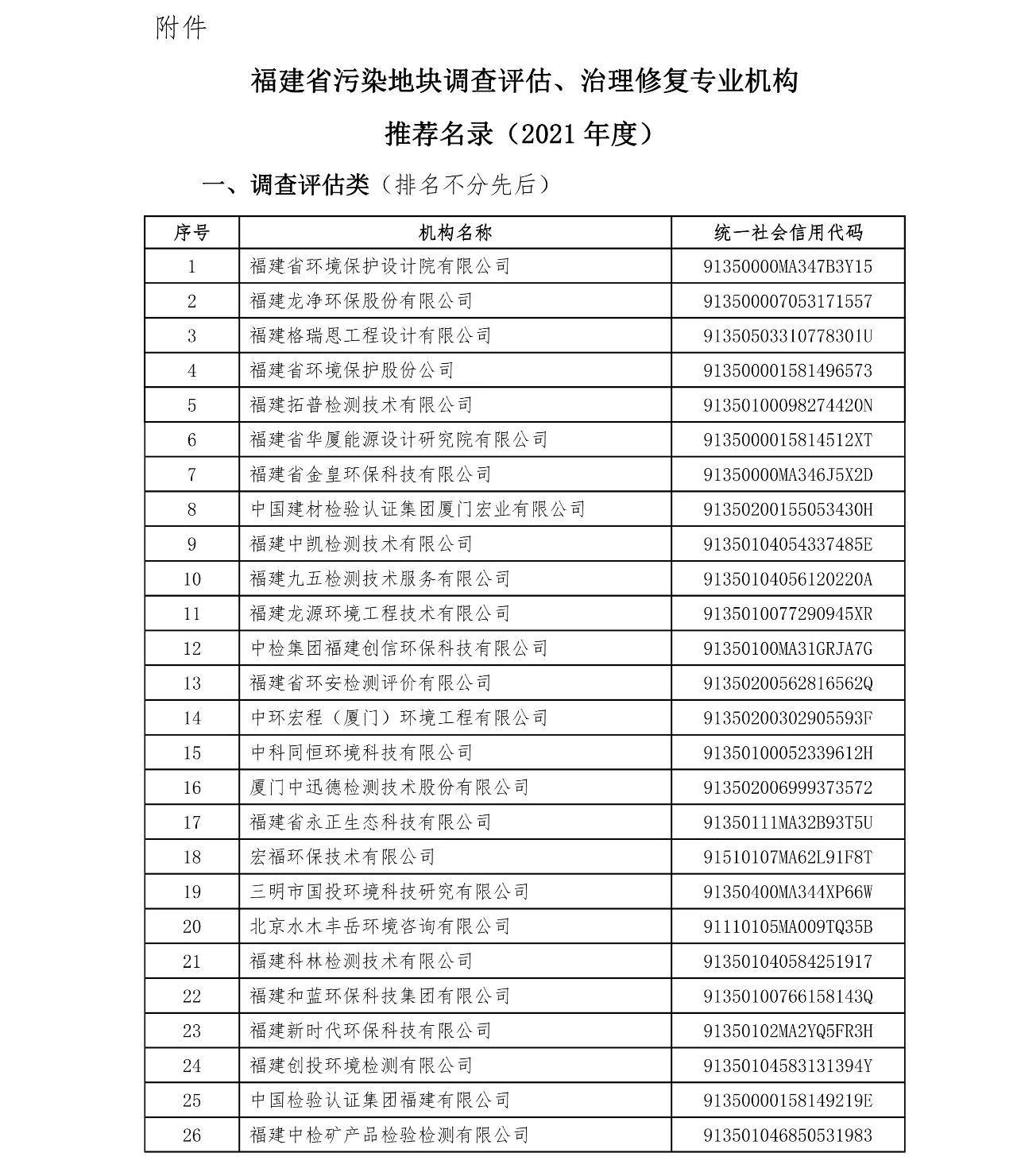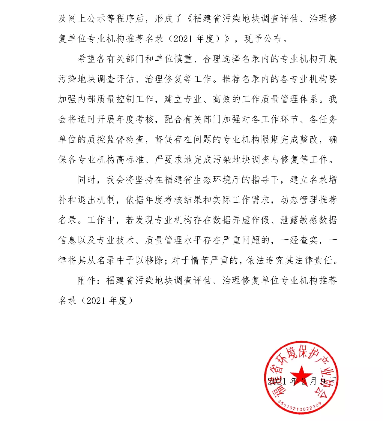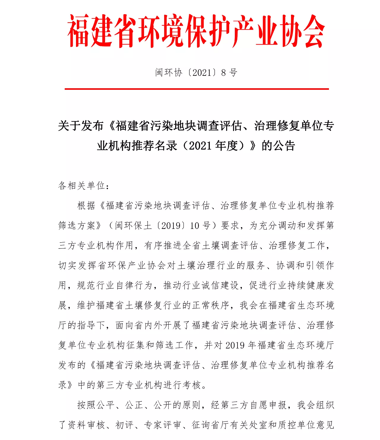 中凱檢測入選《福建省污染地塊調查評估、治理修復單位專業機構推薦名錄(2021年度)》