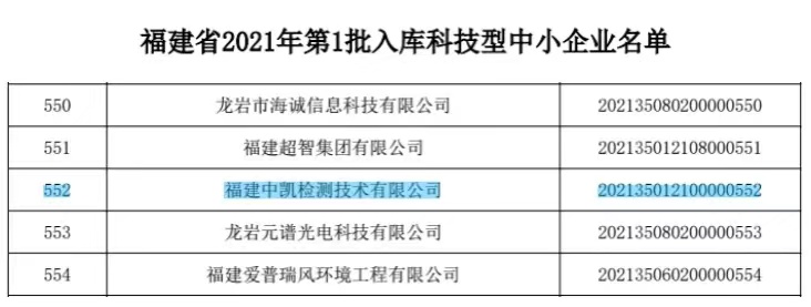 2021年02月23日,根據(jù)《科技型中小企業(yè)評價辦法》(國科發(fā)〔2017〕115號),經(jīng)公示通過,中凱檢測成為福建省2021年第一批入庫科技型中小企業(yè)。